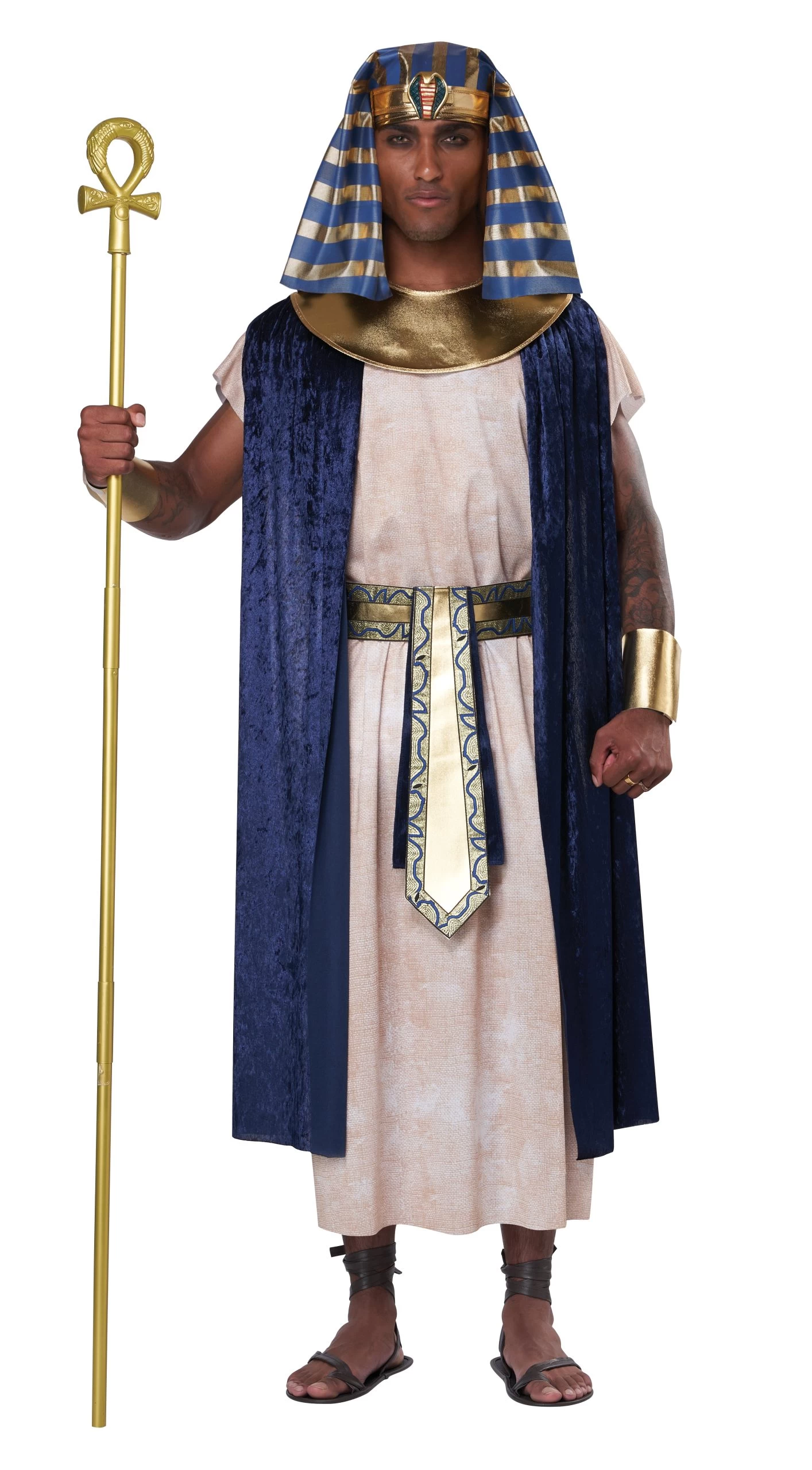 This Ancient Egyptian Costume is a long tunic with a beige woven print. It includes a midnight blue velvet overlay with a coordinating head piece and belt, cuffs, collar, and headband. So many accessories to create the perfect look. Staff not included.