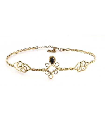 Become a member of the landed aristocracy, or bathe in the limelight at your next Renaissance Faire soire with the Antique Gold and Black Circlet Crown. Featuring an intricate gold twist design with a tear drop faux onyx centerpiece, royalty of all ranks will enjoy the sophistication this piece offers. A chain link on the back makes this circlet adjustable.