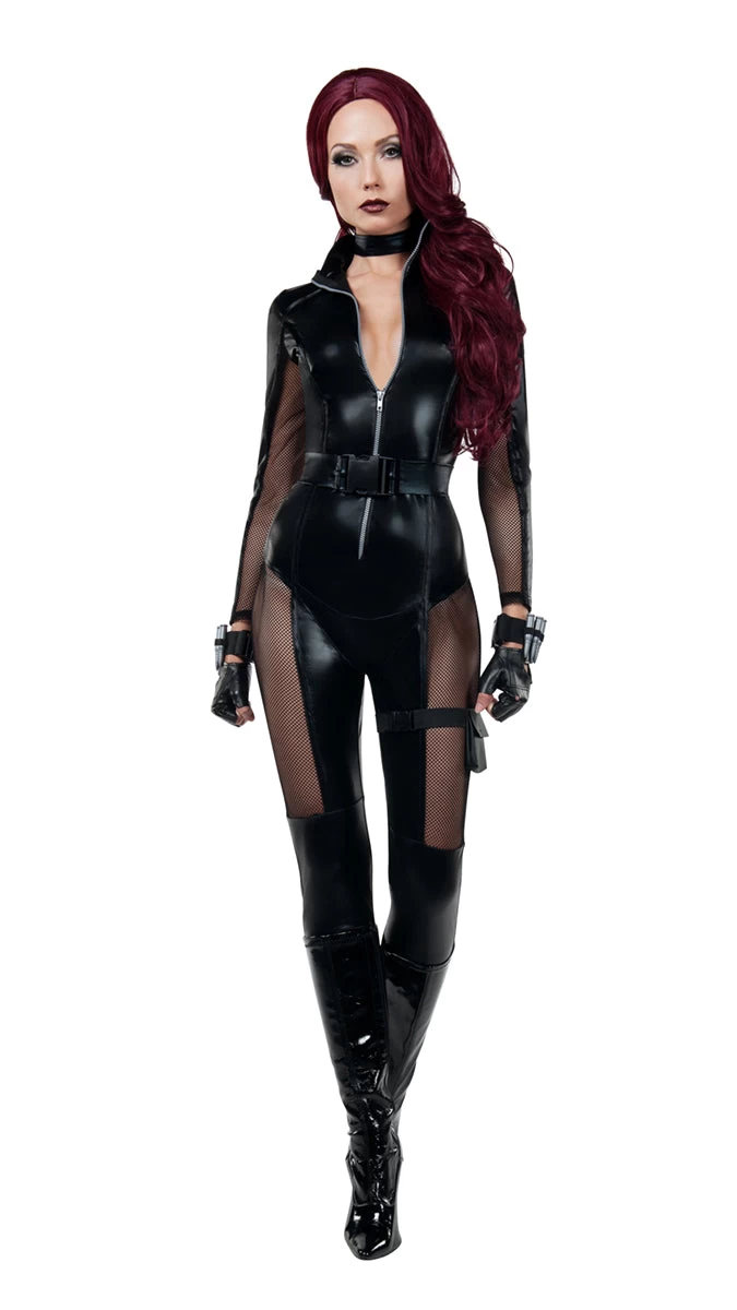 You will be ready to take on anyone in the avenging assassin costume. The zip front wet look catsuit has sewn in mesh inserts on the arms and legs with leg straps, a belt, and other great accessories. 100% Polyester