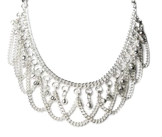 The bangle swag necklace has alternating link chains in a swag design with small bangles that dangle. The link closure allows you to make the necklace smaller as needed. This necklace also makes a great looking headband that can be clipped into the hair. Great for belly dancers, Egyptian, Goddesses and more! Made in India.