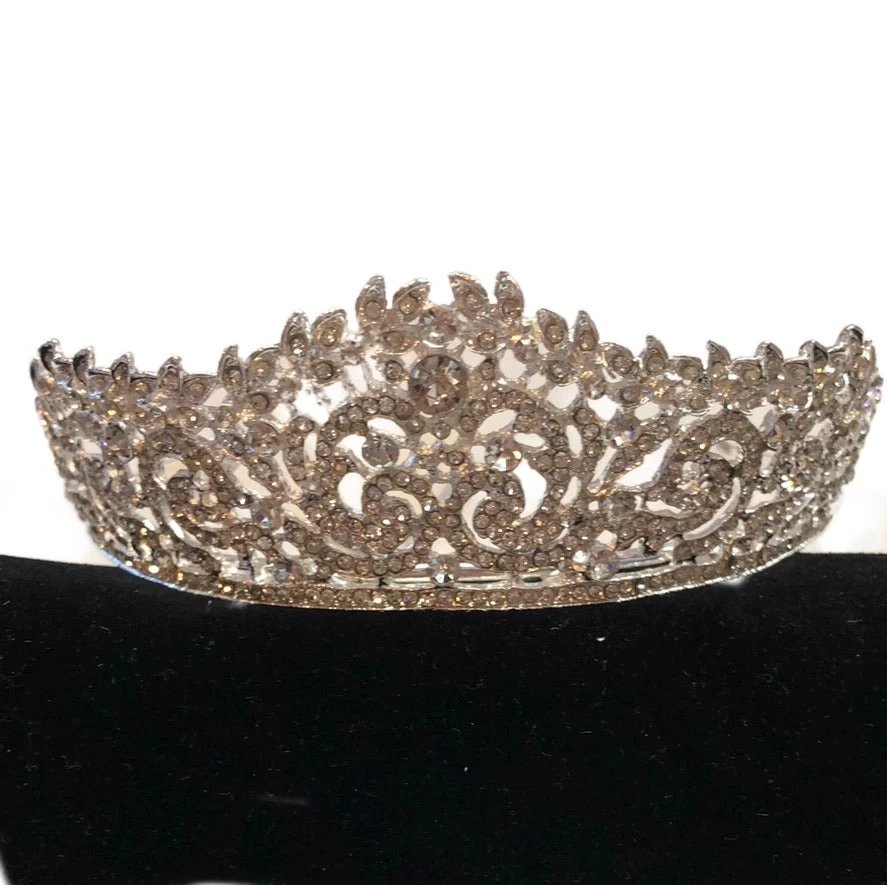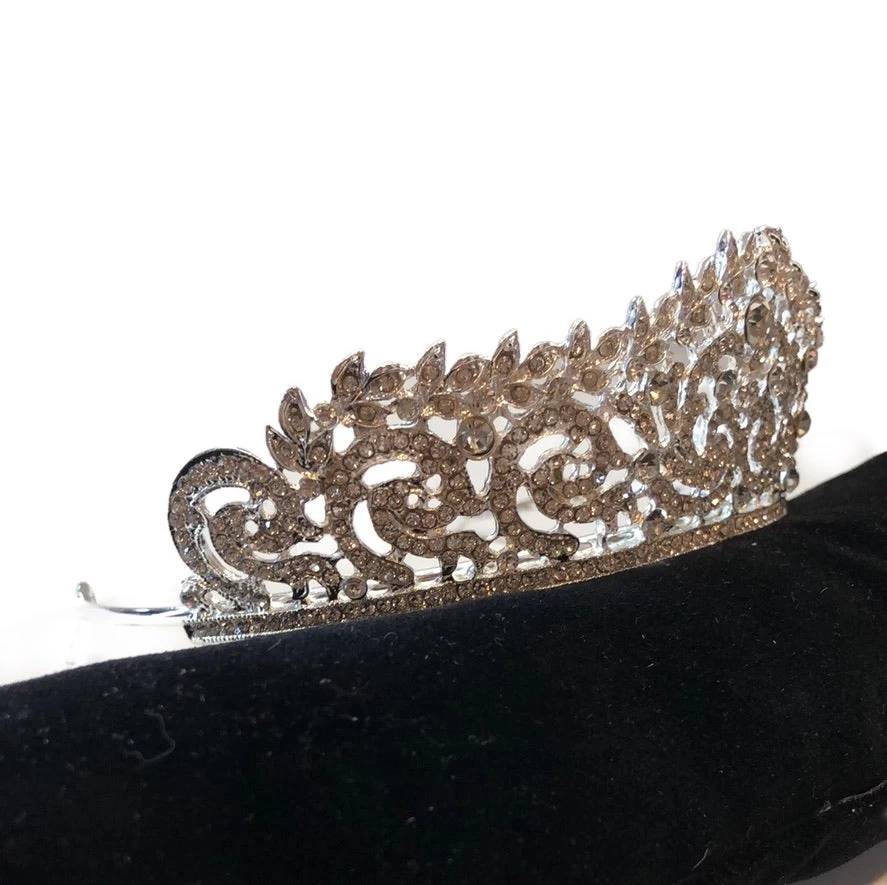 The beautiful and elegant Baroque Style Crystal Rhinestone Tiara is a beautiful accessory for any royal occasion. The crown includes two holes on each side of the crown to add a hairpin or comb for a more secure fit. The height is 1.75″ with about 7″ of scrolling detail across the width of the crown.