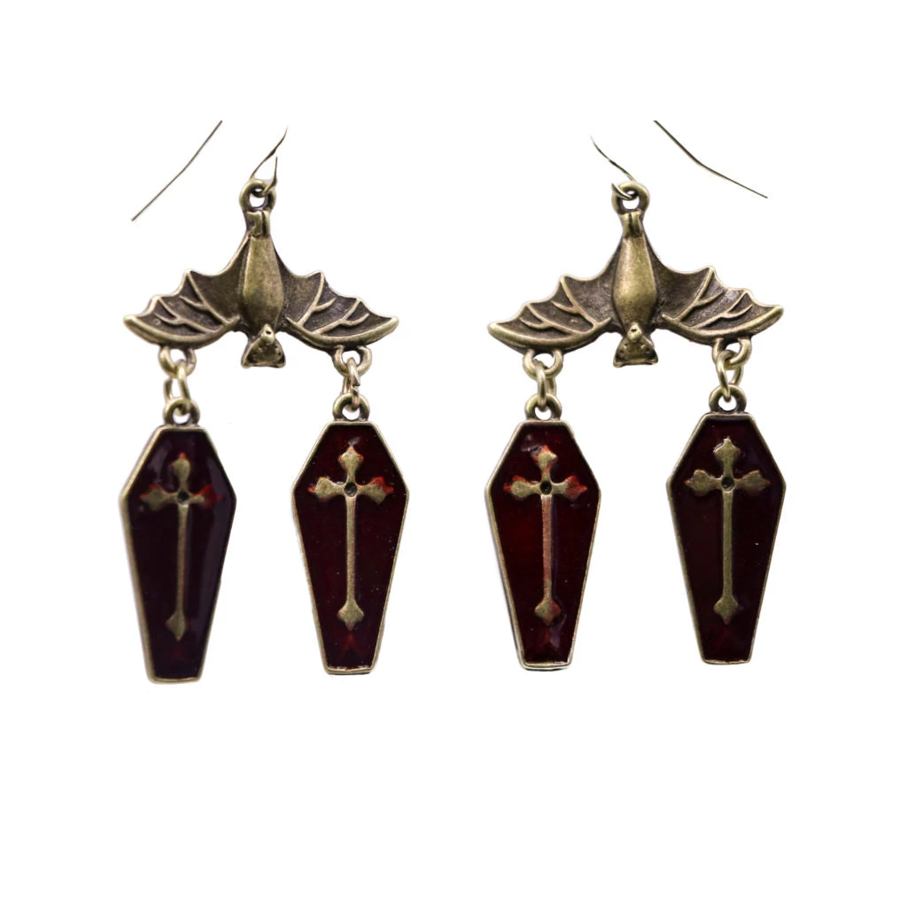 A petite pair of hanging golden bats, with 2 red cross caskets suspended on each side of the wings.