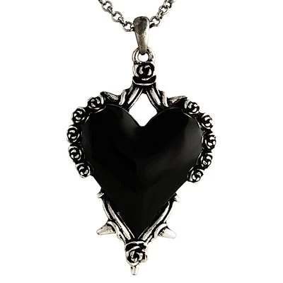 The black heart necklace has silver roses and thorns along the outline with an attached chain.