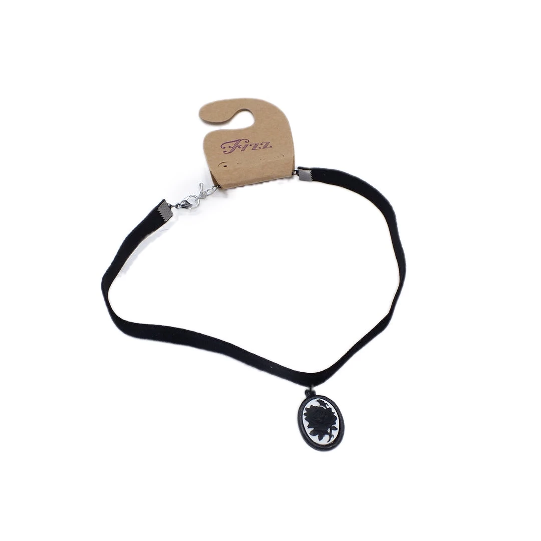 The elegant black velvet ribbon choker has antiqued raised black rose cameo with a white background and black frame. Adjustable back lobster clasp. The velvet ribbon is 3/8″ wide by 12″ long and the cameo is 7/8″ long and 5/8″ wide. Perfect for Dia De Los Muertos, Saloon Girls, Gothic, Vampires, Witches and anything Halloween. Look for coordinating earrings and rings. Made in the USA.