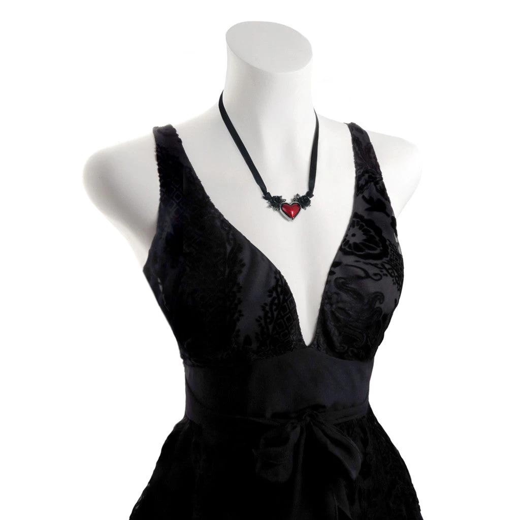A pearlescent-effect trans-red enameled pewter heart necklace motif, flanked either side with roses with a black acrylic flower and on a split 38″, (96cm) long, doubled, 7mm black ribbon necklace, to be hand tied.