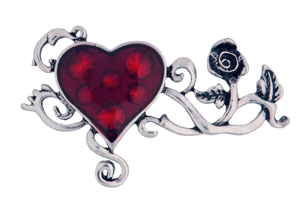 The elegant and intricate ring is a beautiful accent piece to any “dark” costume attire or for everyday wear. The ring features a deep ruby red heart and a small silver rose connected by delicate swirls and leaves.