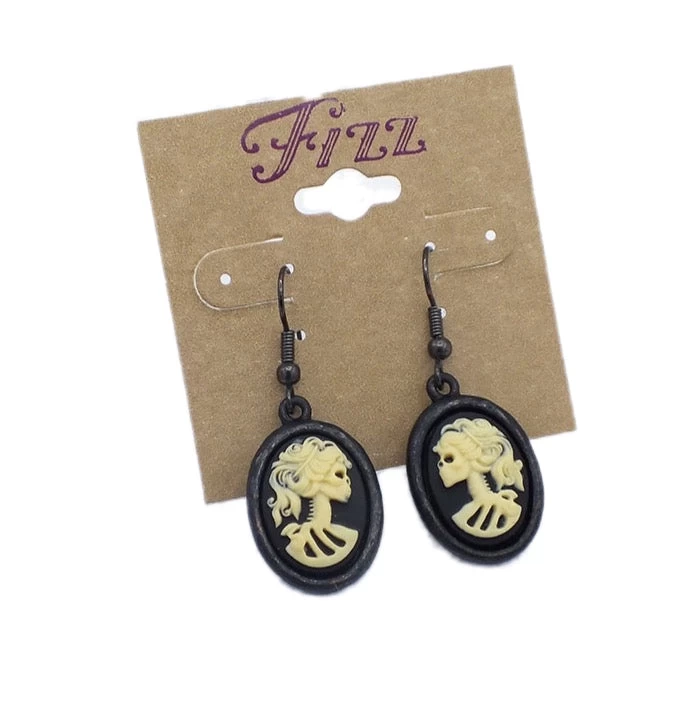 The elegant earrings have an antiqued raised female bone colored skeleton cameo with a black background and black frame. The earrings have a fishhook attachment. The cameo earrings are 7/8″ long and 5/8″ wide. Perfect for Gothic, Vampires, Witches and anything Halloween. Look for coordinating rings and chokers. Made in the USA.