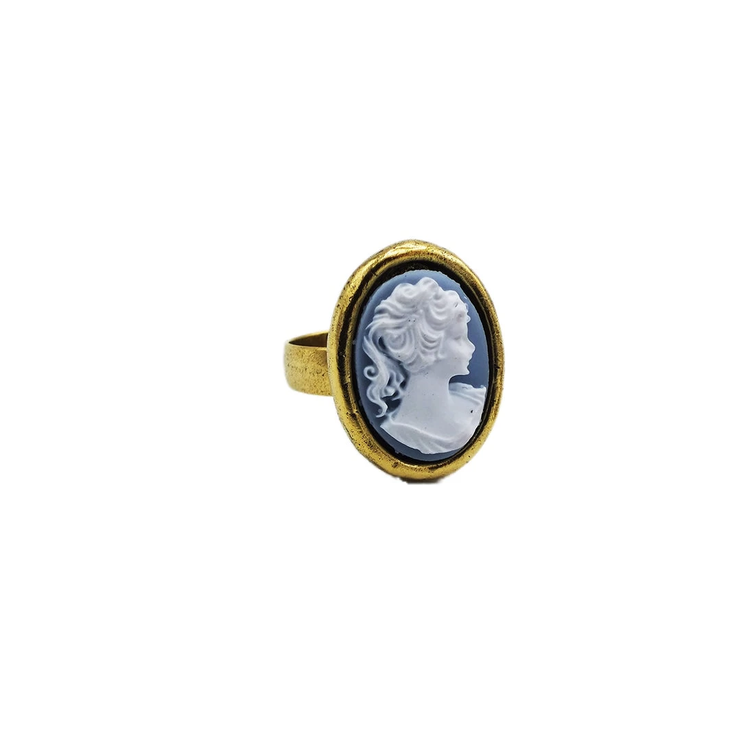 The elegant cameo ring has an antiqued raised ivory cameo of a girl with a ponytail on a classic blue gray background and gold frame. Look for coordinating earrings and chokers. Perfect for Colonial, Victorian or anything Halloween. Made in the USA.