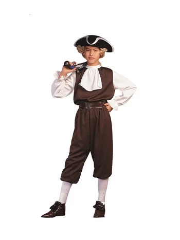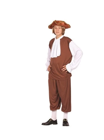 Need a Colonial Costume for a school event? Look no further than the Colonial Costume for children. The top and pants combination includes the brown top with attached jabot and full white sleeves with brown knicker style elastic pants. Easily accessorize up or down to create your perfect costume with accessories sold separately like a wig, tricorn, shoe buckles, knee socks, and glasses. Please note: the teen size option is a rust color instead of brown.