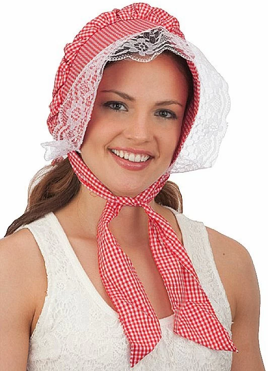 Our Classic Red and White Gingham Bonnet will take back to the Western Frontier. In those days, bonnets were used by prairie women to protect themselves from the wind and the sun. Our bonnet has a firm front frame with lace edging, elasticized back and long fabric ties to finish the look. Great for Western days, Gold Rush, Prairie and Historical events.