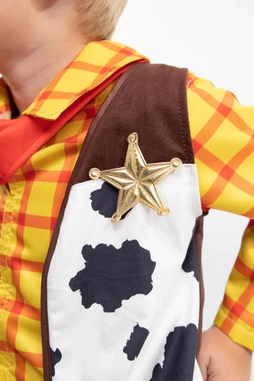Your little one will look like the cutest Woody cowboy doll come to life and will be ready for adventuring in the wild west when they put on their new cowboy costume. Includes a soft yellow and red checked shirt with sewn in suede vest, embellished with golden heat seal sheriff star. The soft stretch knit pants are made to look like jeans also have an elastic waist. Outfit is accented with red knit handkerchief and brown belt with gold heat seal belt buckle. You will love the comfortable design without any itchy seams and the durable design of this adorable dress up costume. Includes shirt and pants only. Cowboy hat, boots, and other Toy Story group costumes available separately.