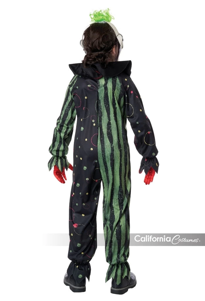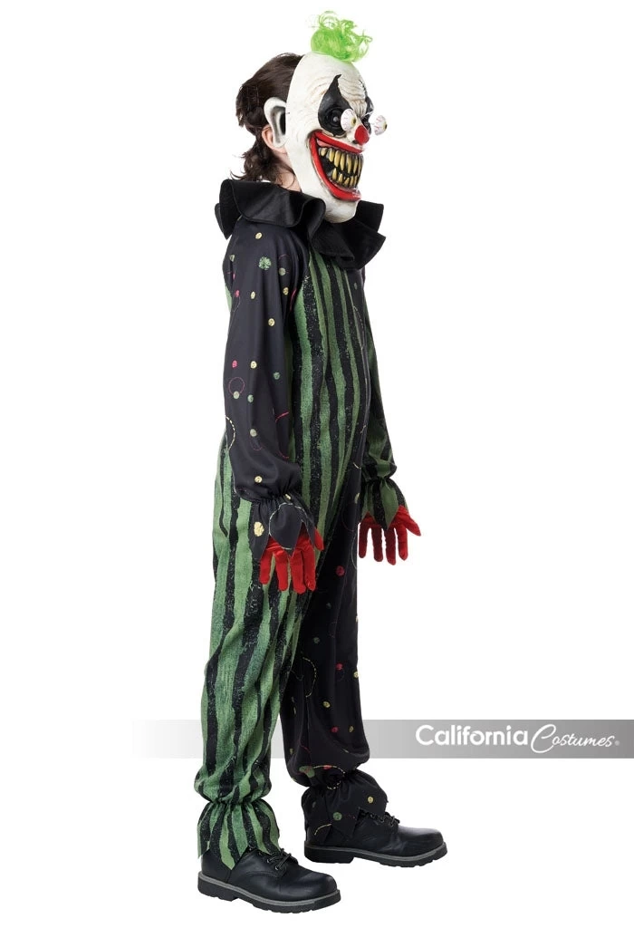 Beware of this piercing clown stare down. The Crazy Eyed Clown child costume is a jumpsuit with attached pom-poms, a black collar and a mask with spring attached bobble eyes. Jumpsuit is Velcro fastened in the back. Not included: red gloves, hammer, shoes.