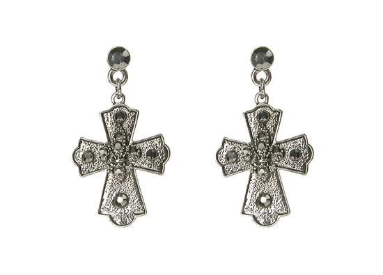 Rounded silver cross earrings with dark rhinestones, have a stud style piercing but dangle and are approximately 1″ tall. Great for 80’s Rocker Costume, or your neighborhood goth!