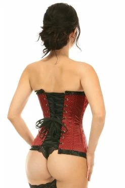The elegant corset features large front clasps. This corset is the perfect finishing piece for your Steampunk or Gothic Vampira Costume. This elegant corset features a a tonal floral brocade look, a sweetheart neckline, black faux leather trim, four front clasp closures, multiple chain detailing on sides, and a lace up back. Check out our accessories to make this costume great!