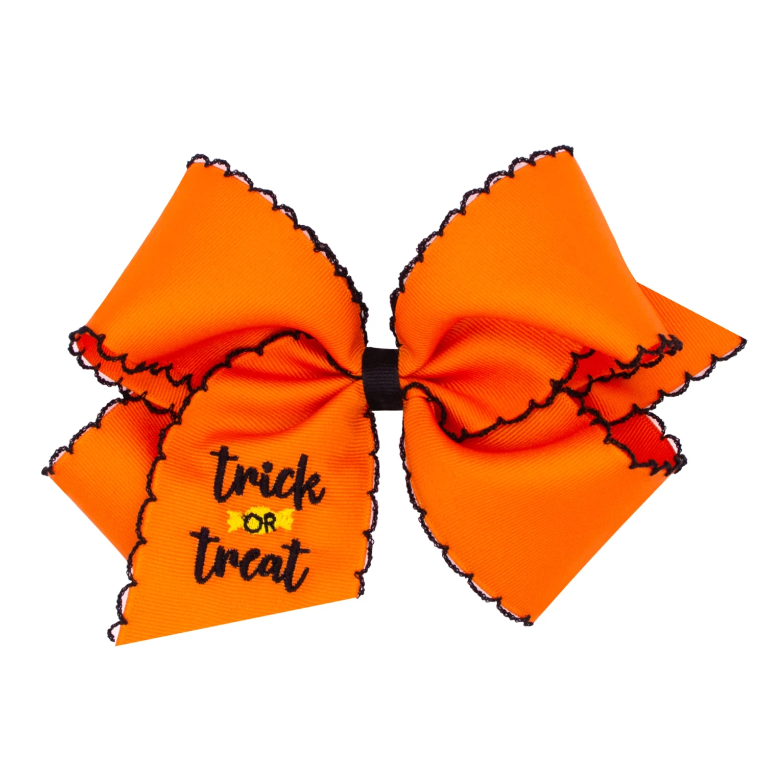 Now you can celebrate Halloween everyday with this adorable embroidered “Trick or Treat” and edged Halloween themed hairbow. They are available in two sizes. This top quality bow has a gripper on the clip so it stays in place and doesn’t slip down. Available in Medium or Large.