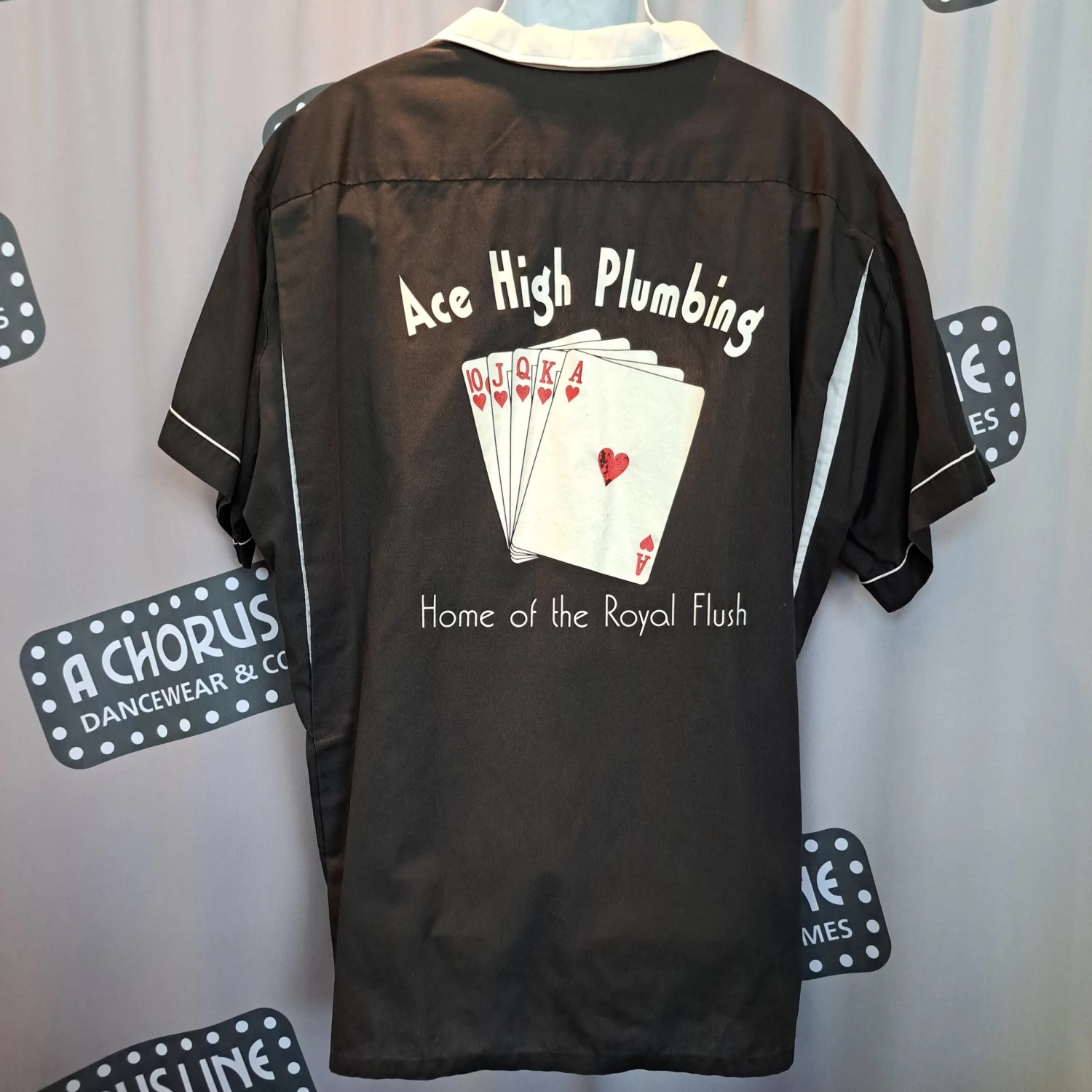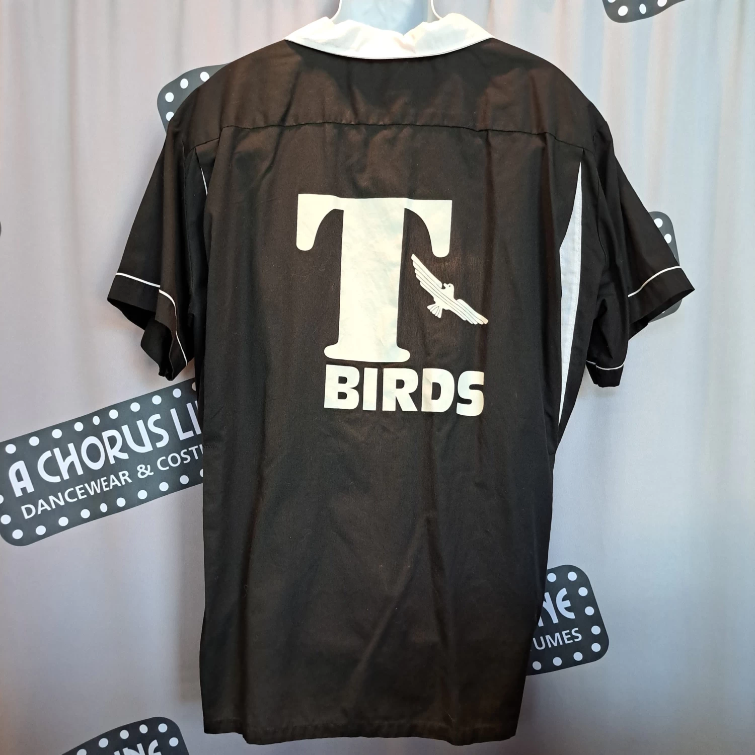 Former Rental classic bowling shirt is black with white collar and trim plus 2 front pockets. There is a large white T-birds logo on the back to transport you to the 1950’s. To complete this look, we have plenty of other 50’s accessories available for you and your partner!