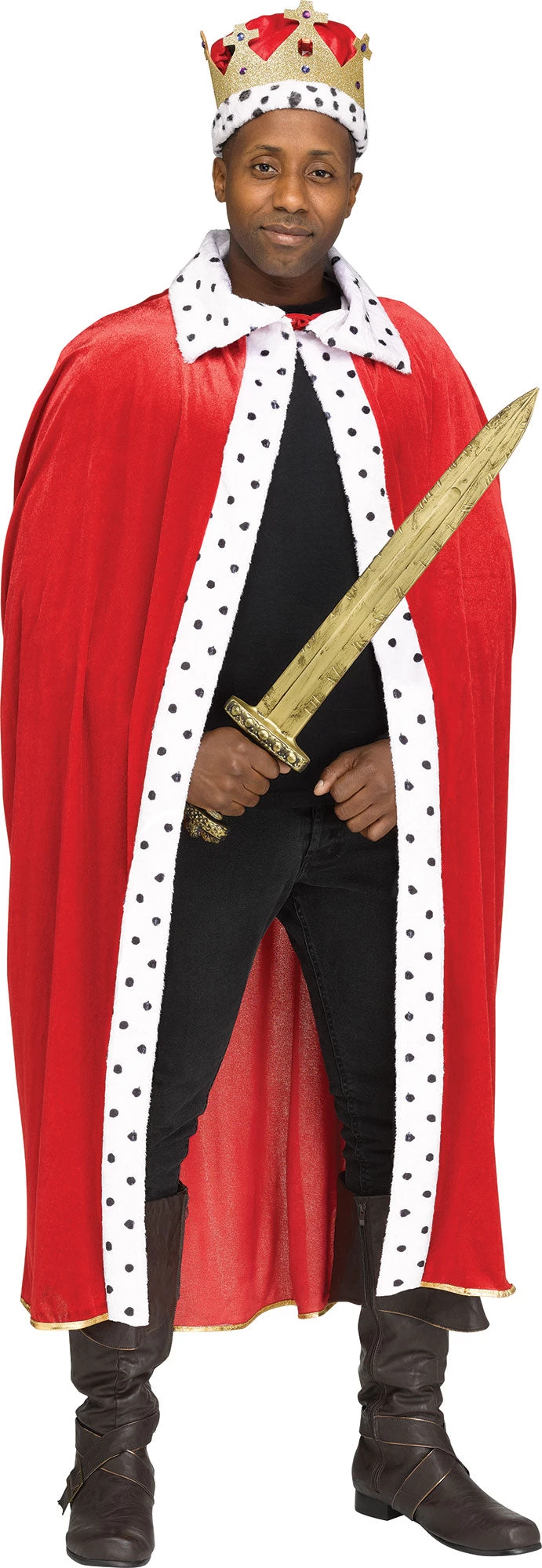 Luxurious robe with faux ermine plush trim and collar is a royal way to celebrate Halloween. Includes matching crown with metallic trim.