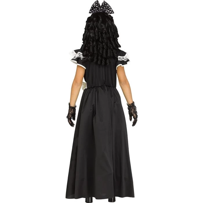 This creepy Victorian Dolly could be the doll of your dreams or your nightmares. Featuring a black floor-length dress with tattered white layers and short ruffle sleeves. The headband bow and lacey wrist gloves really bring this whole costume together! Add creepy makeup and some fake blood to complete this look!