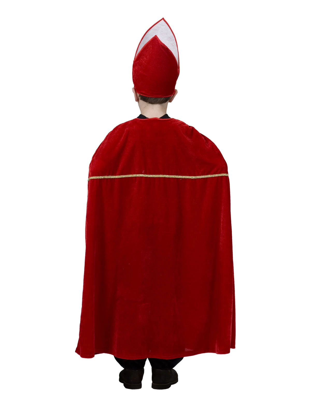 The Nicholas Cape and Hat set is a perfect ensemble for the Holidays or for religious plays. The red velvet cape has gold trim with a tie closure at the neck. The hat has the same soft velvet with gold trim.