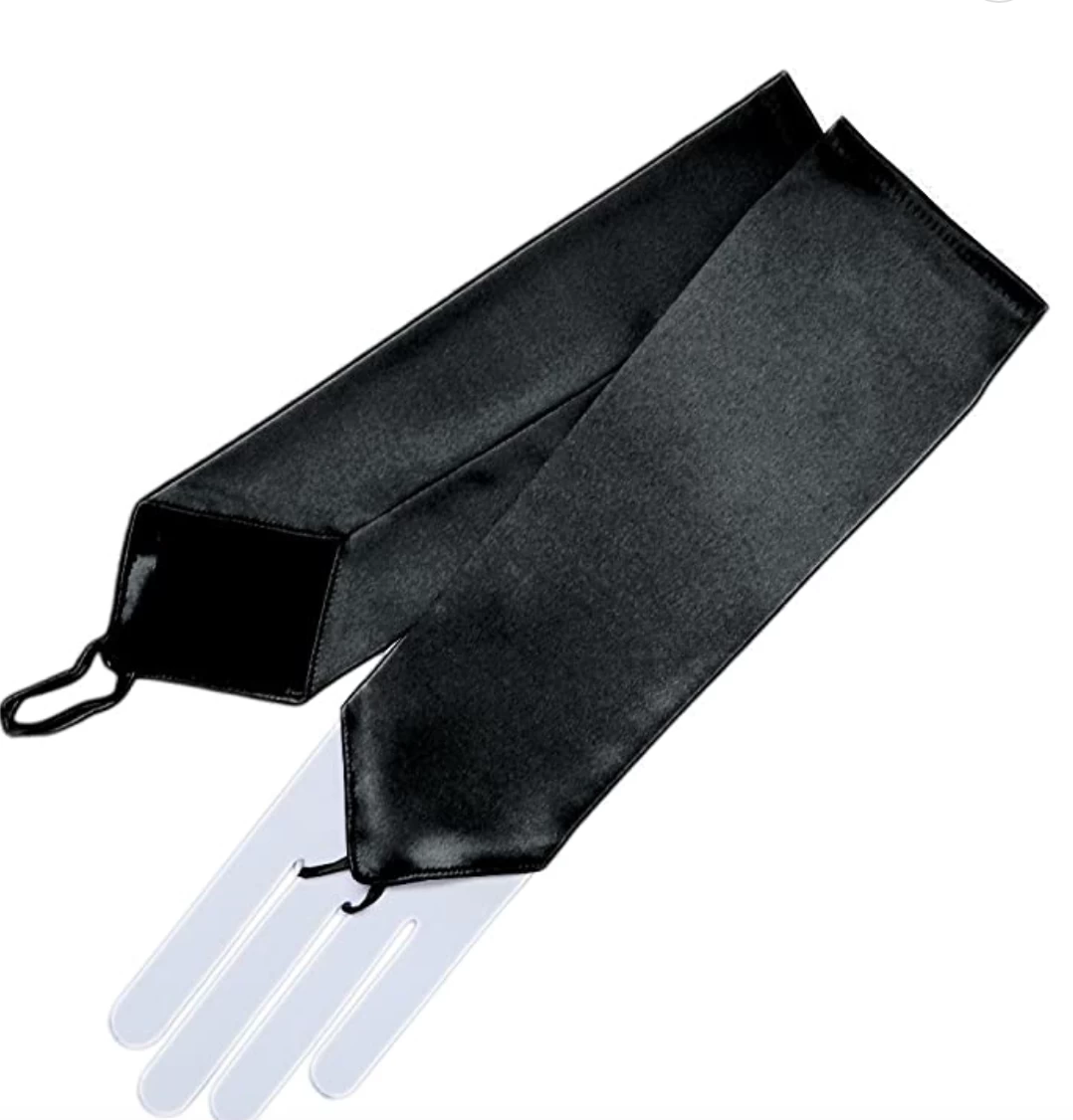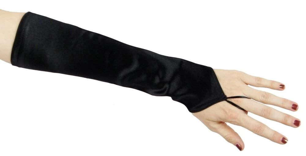 The spandex satin fingerless gauntlet measures approximately 14 inches long and reaches just below the elbow. The fingerless design has a v edge near the fingers with a ribbon loop for middle finger. Elegant and practical for evening wear, Gatsby parties or Cosplay!