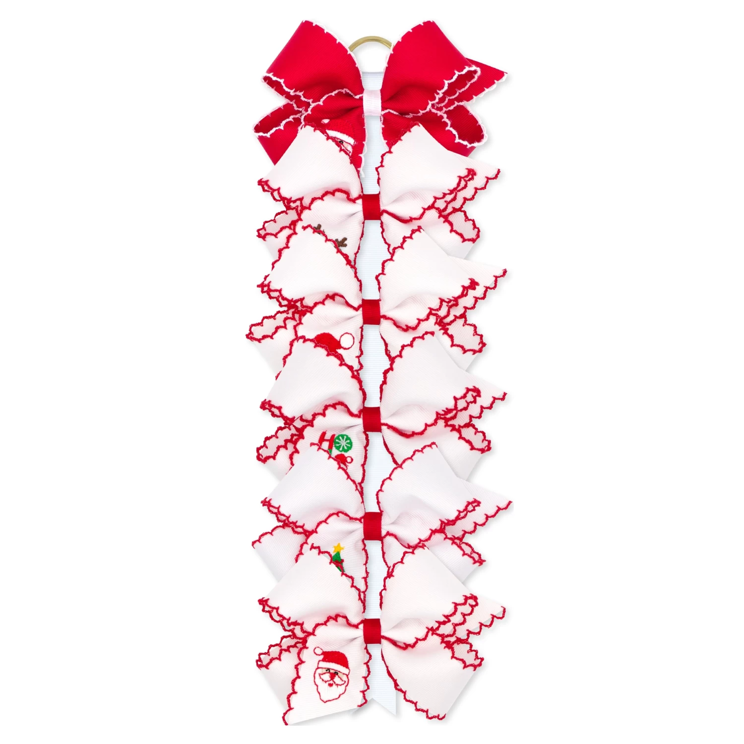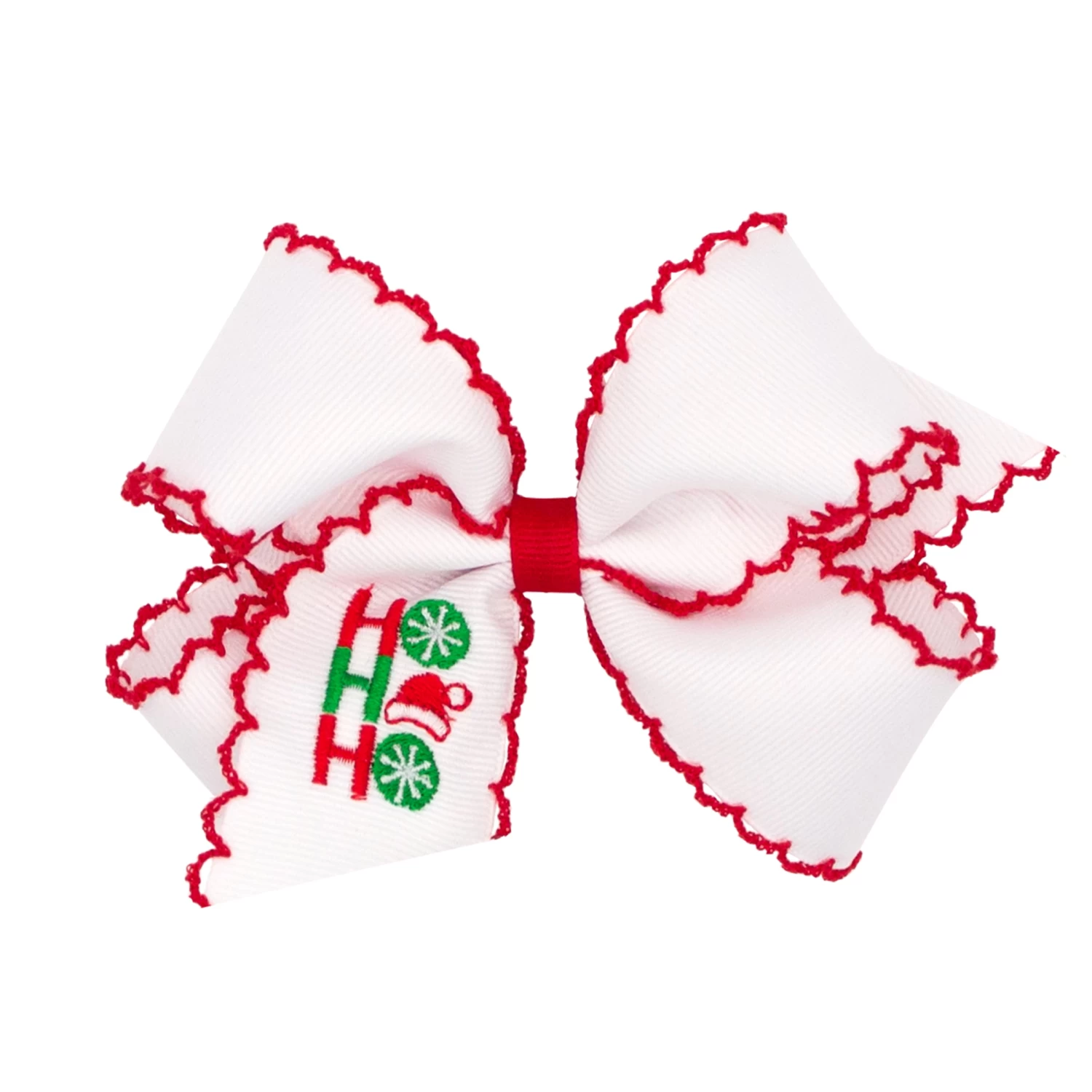 The holiday themed specialty bow look great with dresses or everyday. Choose from an assortment of styles with a fancy moonstitch edging and embroidered holiday icon. These top quality bows have a gripper on the clip so they stay in place and won’t slip down. Available in Medium (Bow is 3″ high by 3.5″ wide).
