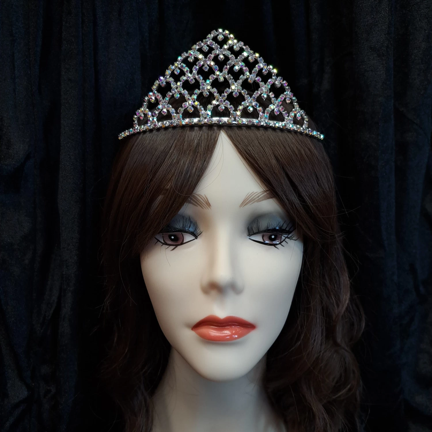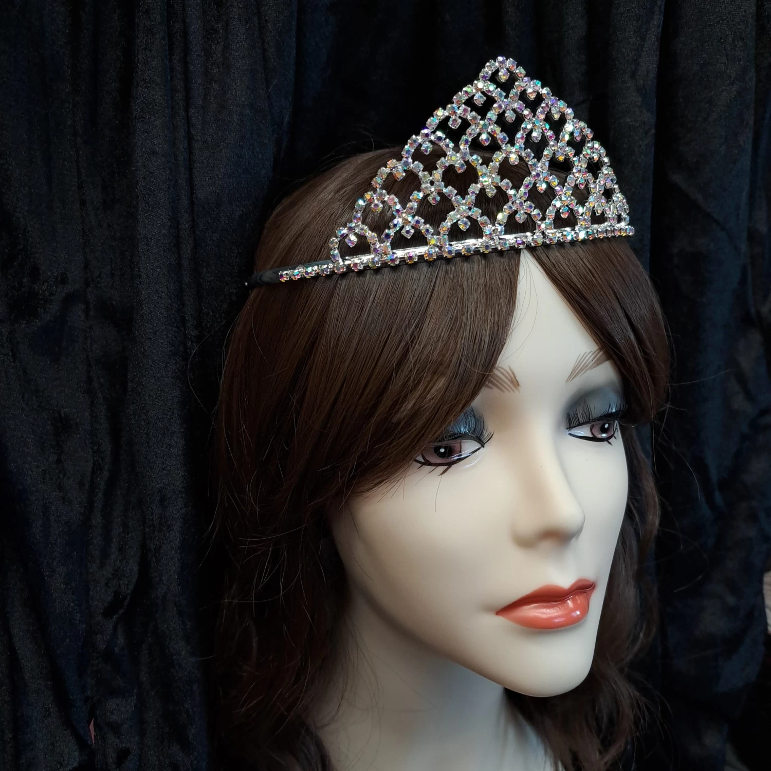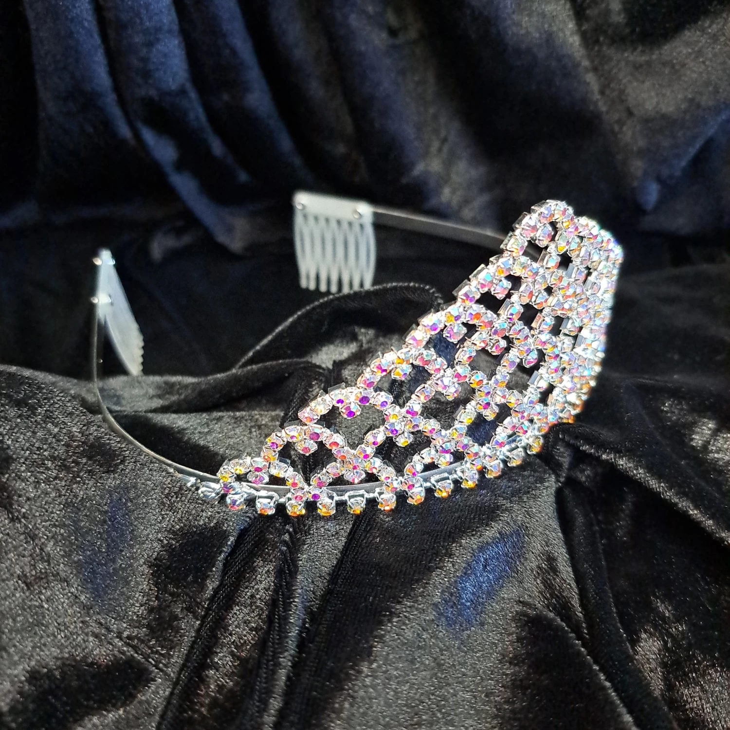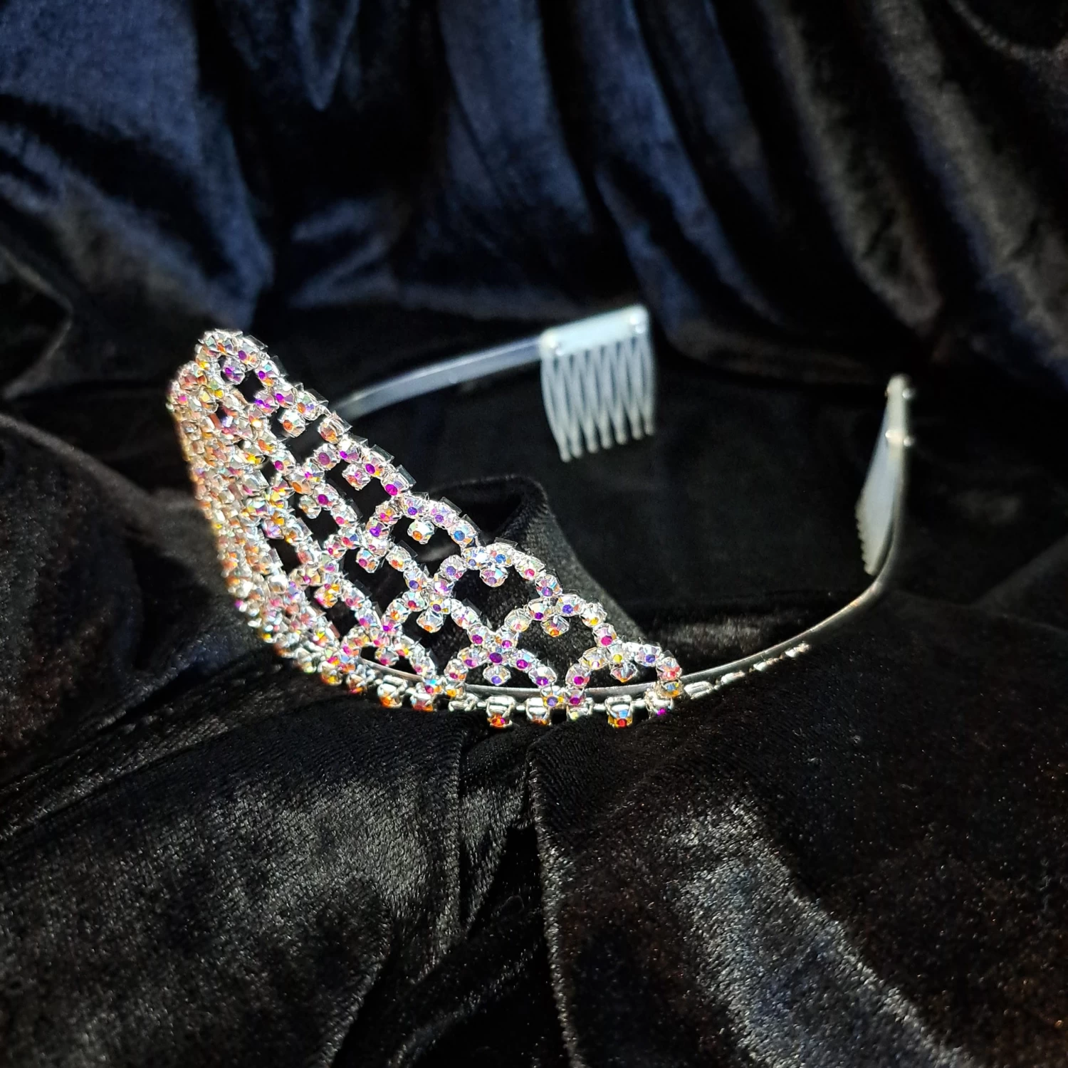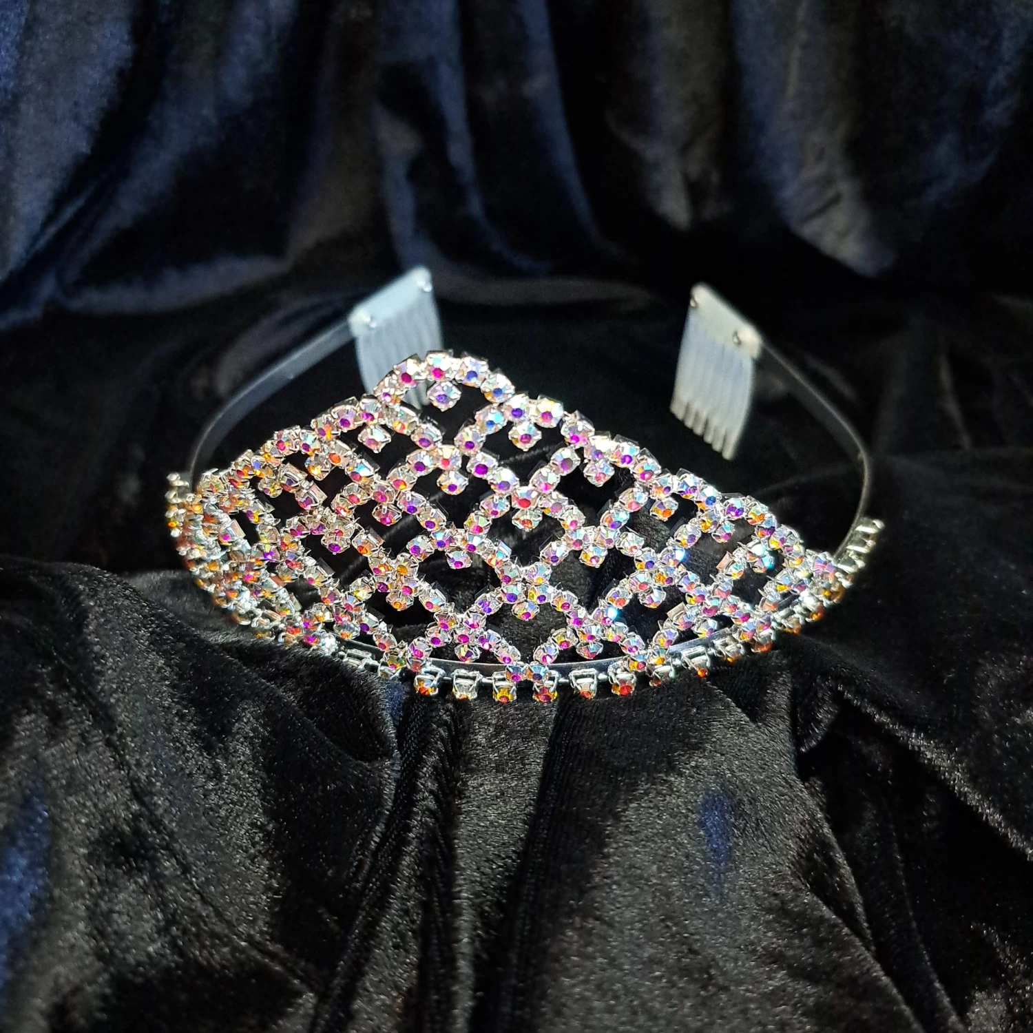 This iridescent jeweled tiara is a beautiful accessory for any royal or dark occasion. The durable metal crown includes 2 combs on the sides, but feel free to add bobby pins for a more secure fit.