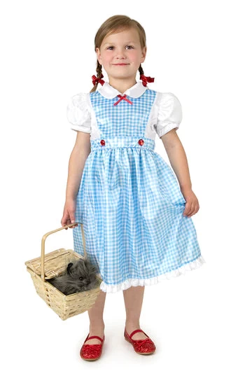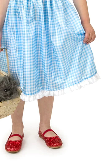 There’s No Place Like Home! With this blue and white gingham dress, your little one will look and feel just like Dorothy! The blue gingham fabric that extends from the stretch velvet bodice to the china silk skirt plus 2 red gems along the waist. The puffy white sleeves match the white collar and dainty ruffle on the hem. Includes two glittery red bows! You will love the comfortable design without any itchy seams and the durable design of this adorable dress up costume. Also available separately: ruffled socks, toto in a basket, deluxe hairbows, and the ruby red slippers.