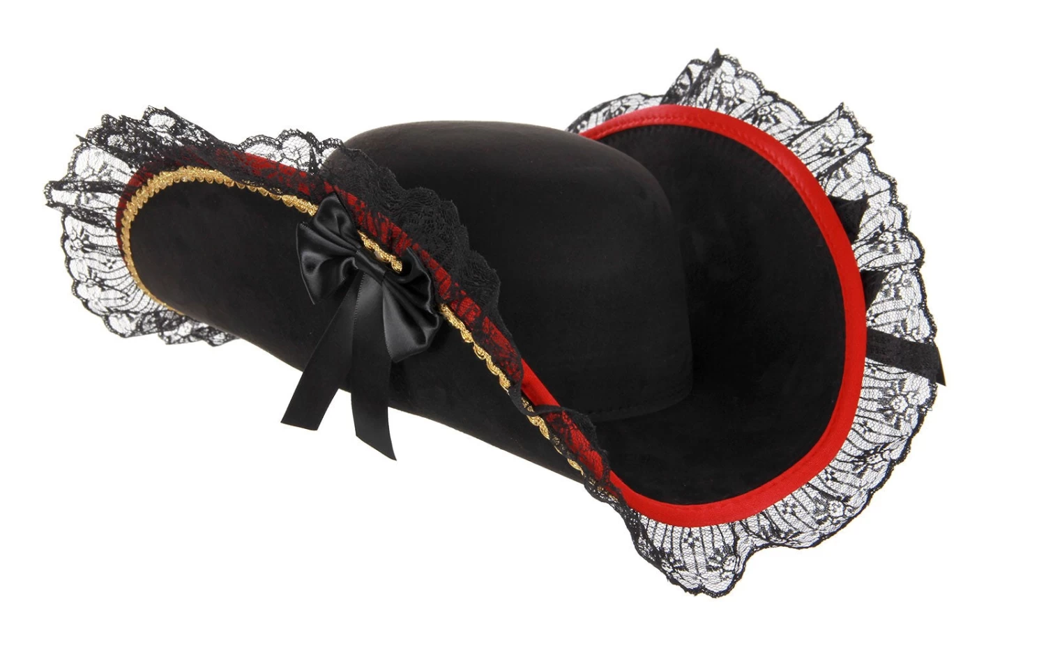 Navigate to your closest coast or pirate costume party in this lavish Lady Pirate Hat by elope. Featuring an exaggerated bicorn shape with bendable wire brim, this haughty headpiece is adorned in classic black fabric decorated with a richly hued ribbon and embroidered accent, plus a silky black bow embellishment for the fashion-conscious corsair. A ruffled black lace trim tops the brim for a sophisticated silhouette fit for a pirate queen. Designed to fit lasses and buxom buccaneer wenches of various sizes with the aid of the internal size adjuster, this hat makes a great addition to your whimsical wardrobe or novelty dress-up collection. Parade, pillage, or plunder in confident scallywag style in this Lady Pirate Captain Hat by elope.