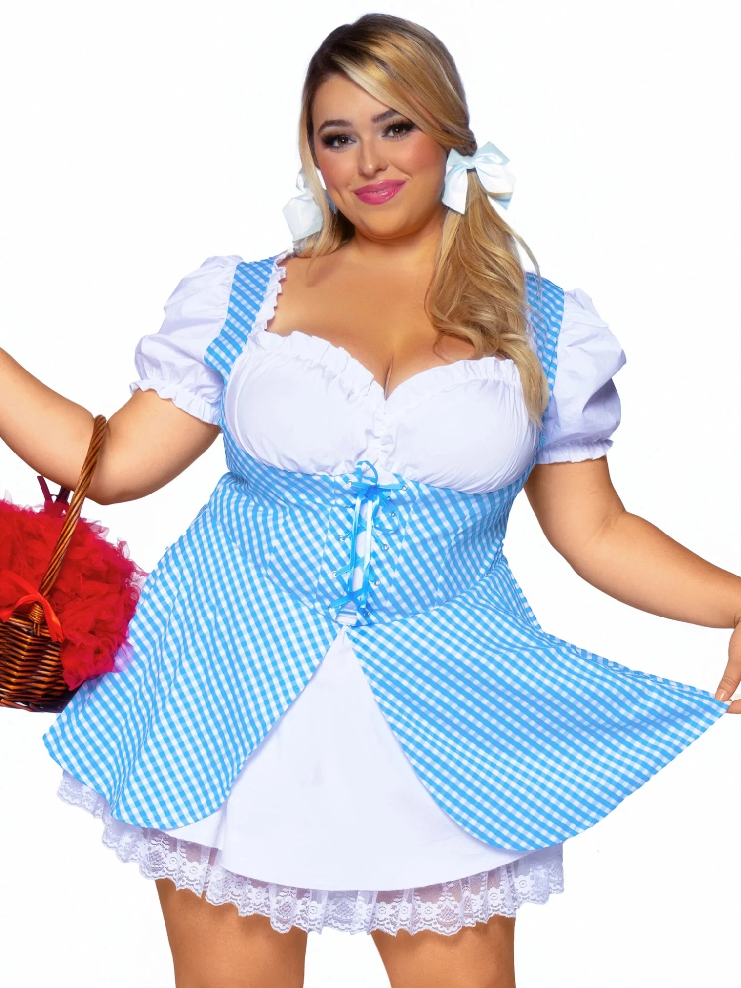 There’s No Place Like Home! With this blue and white gingham dress, you will look and feel just like Dorothy in the Wizard of Oz! Show off those stunning curves with the fitted lace up bodice, ruffled trimmed peasant top and fluttering circle skirt. The rounded split skirt and puff sleeves add the finishing touch to this delightful look. This costume is also great for other farm girl and cottage core cosplays. Also available separately: ruffled socks, toto in a basket, deluxe hairbows, and the ruby red slippers.