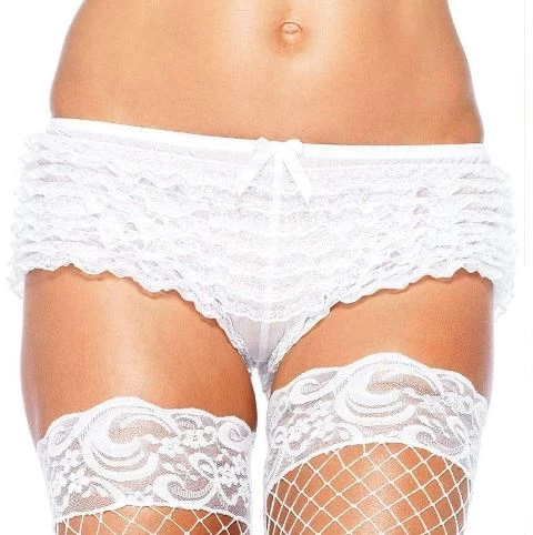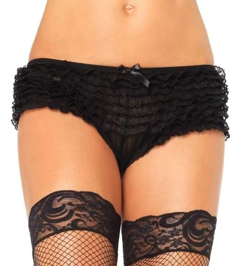 Adorable ruffled micro boy cut shorts are a great costuming bottom to go under costumes or to wear by themselves for a sexier look. The lace is sewn onto a sheer mesh stretch fabric so they are slightly sheer. Available in two sizes and in three colors, they run small so for more coverage go bigger.