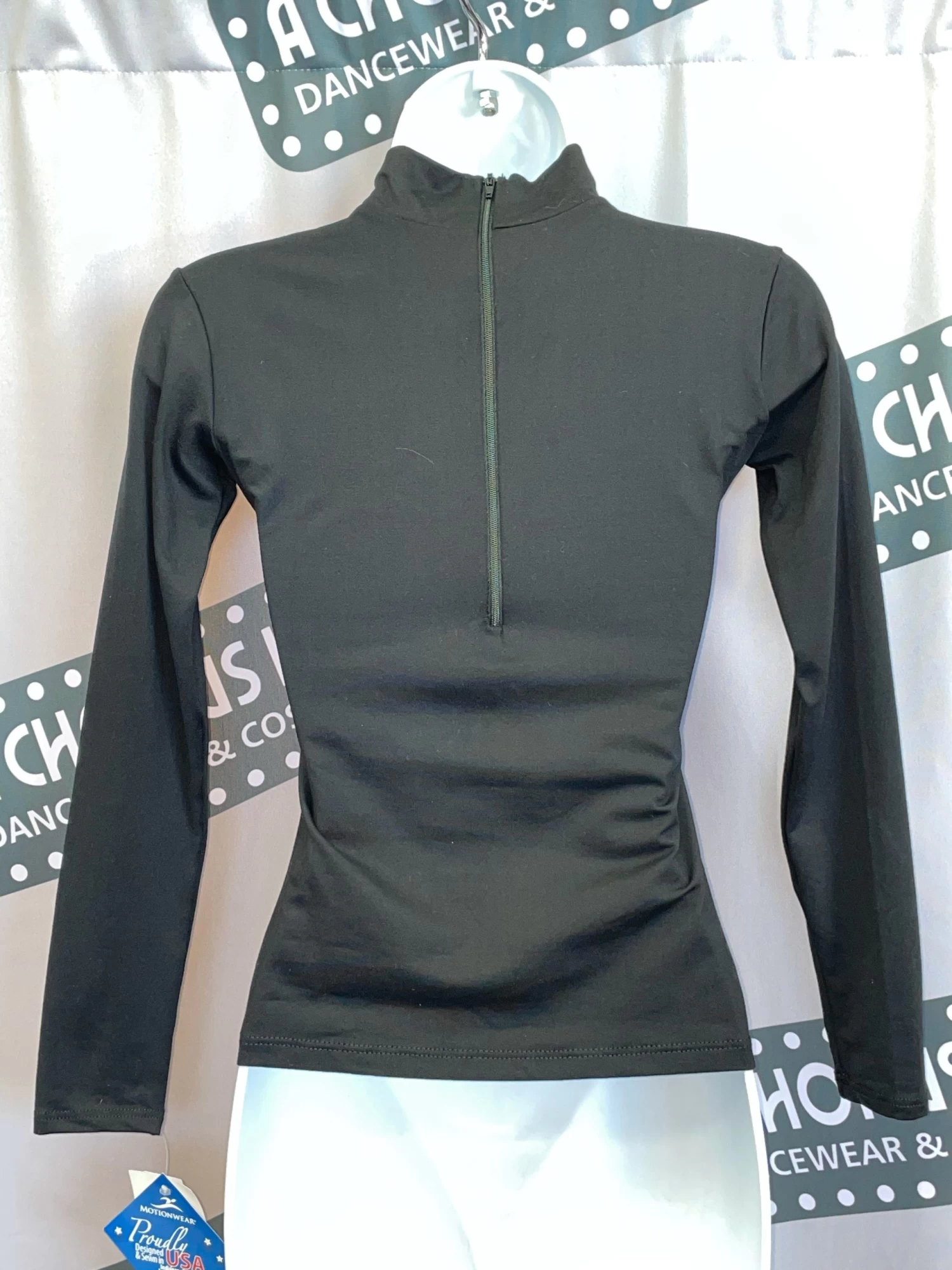 Great quality heavy weight long sleeve turtleneck shirt features a back zipper. The waist length shirt makes a good gender-neutral style for theater, dance or athletics.
