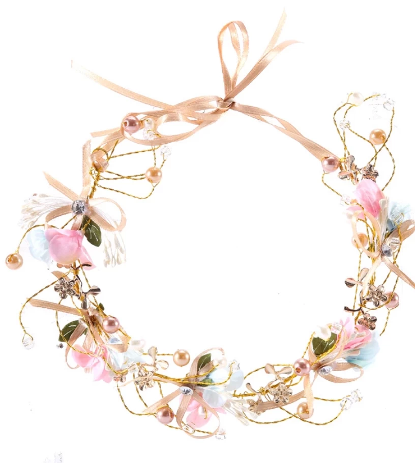 Beautiful and subtle floral wreath headband features mini light blue and light pink roses with crystals and beads with ribbon tie back. The wreath looks great for Renaissance costumes, Oktoberfest maidens, Flower Child Costumes or for modern day music festivals.