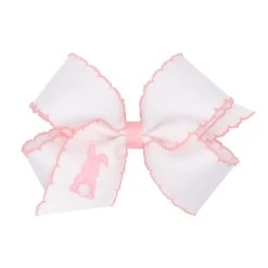 This unique hair bow features a Easter themed embroidery on the tail of a medium moonstitch bow for an accessory that is sure to delight.
