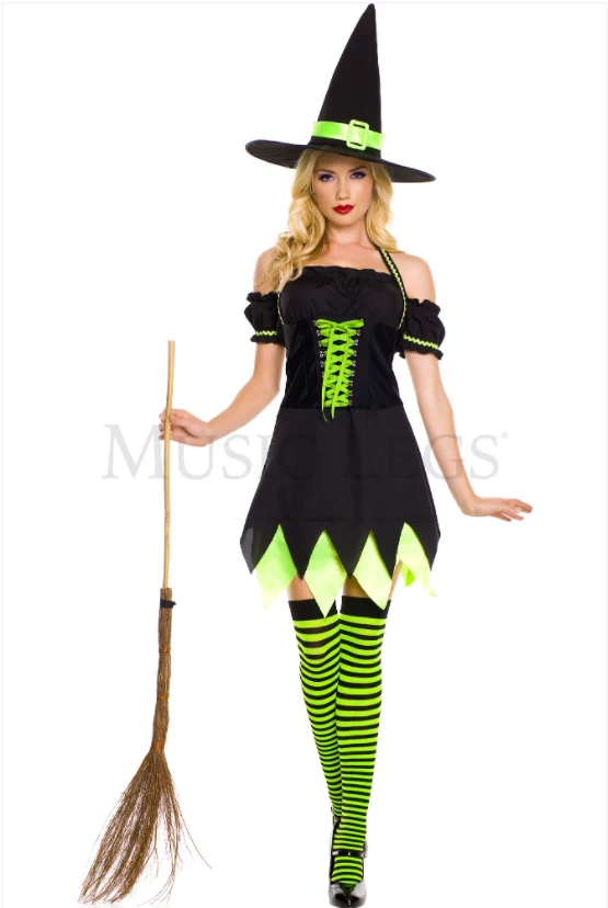 This fun and flirty black halter witch dress has off-the-shoulder ruffle sleeves with a tattered double layer skirt. The bright green lace-up waist matches the band of the classic pointed witch hat. Pairs perfectly with our bristled broom and striped stockings sold separately.