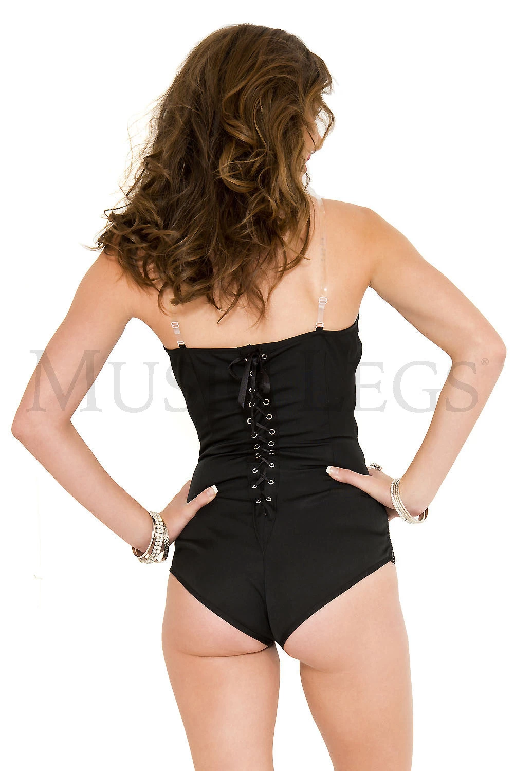 The black strapless lace-up back bodysuit can be anything you want it to be! A great base for Playboy Bunny, catwoman, dominatrix, police officer, black widow and anything you can imagine. Features attachable clear bra straps.