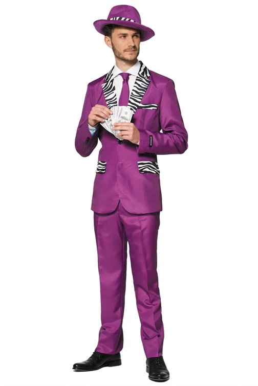 The Pimp suit is a brilliant purple suit with zebra print on the lapel and pockets, plus purple tie. This look is sure to make you stand out!
