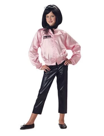 There are two different Pink Ladies Jackets here. For size Medium, (the model with the dark hair) has Pink Ladies written in pink on the front right side of the jacket outlined in a black rectangle and the neckscarf is black. For size X-Small, the jacket says Pink Satin Ladies in black script on the left side of the jacket and on the back and the neck scarf is black with white polka dots. Both styles have soft wrist cuffs and a zippered front. Looks great with black pedal pushers or a poodle skirt. Accessories available separately. If your size is not avaialble here, we have other similar jackets available.