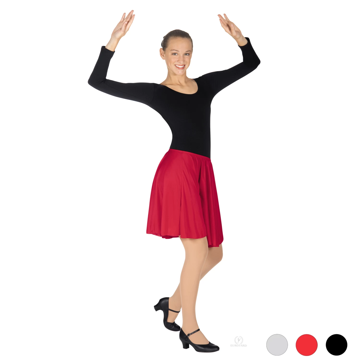 Wear this dance skirt for all your character, ballet, musical theatre, and ballroom needs! This Polyester dance skirt comes in three opaque colors, and the covered elastic waistband makes the skirt easy to pull-on and off. Layer over leotards and tights for a clean look, or wear under a dance overlay for a lyrical costume.