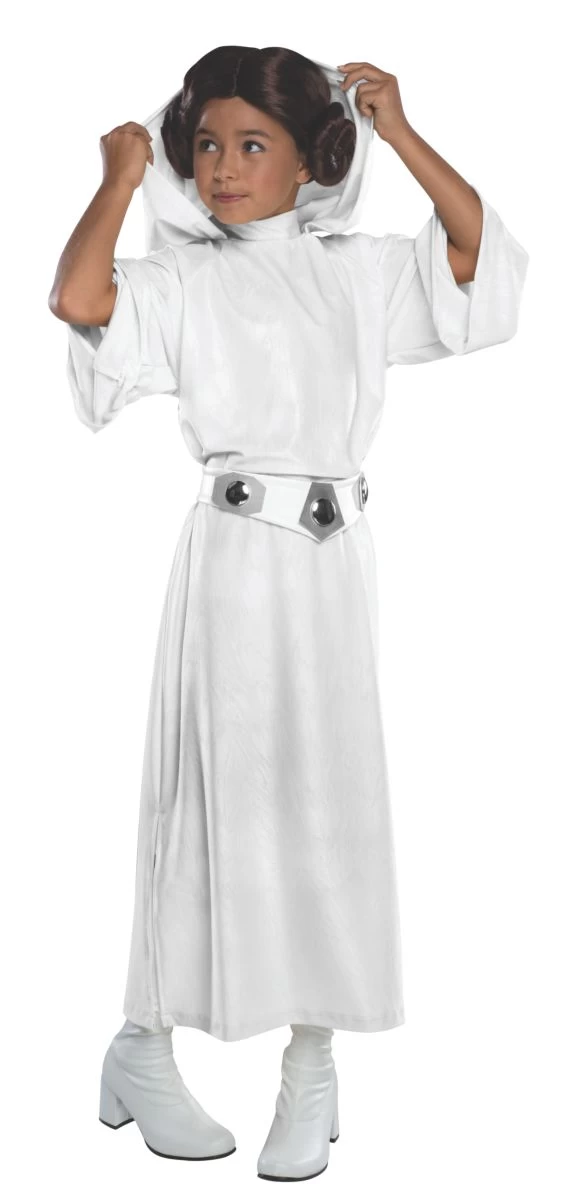 Star Wars’ iconic rebellious daughter of Darth Vader is the strong and powerful Princess Leia. Channel her inner power with this Princess Leia Costume for children. The white subtle shimmer hooded dress has a slightly blousy look but cinches in at the waist with the included belt. It also includes her classic double bun wig in brown.