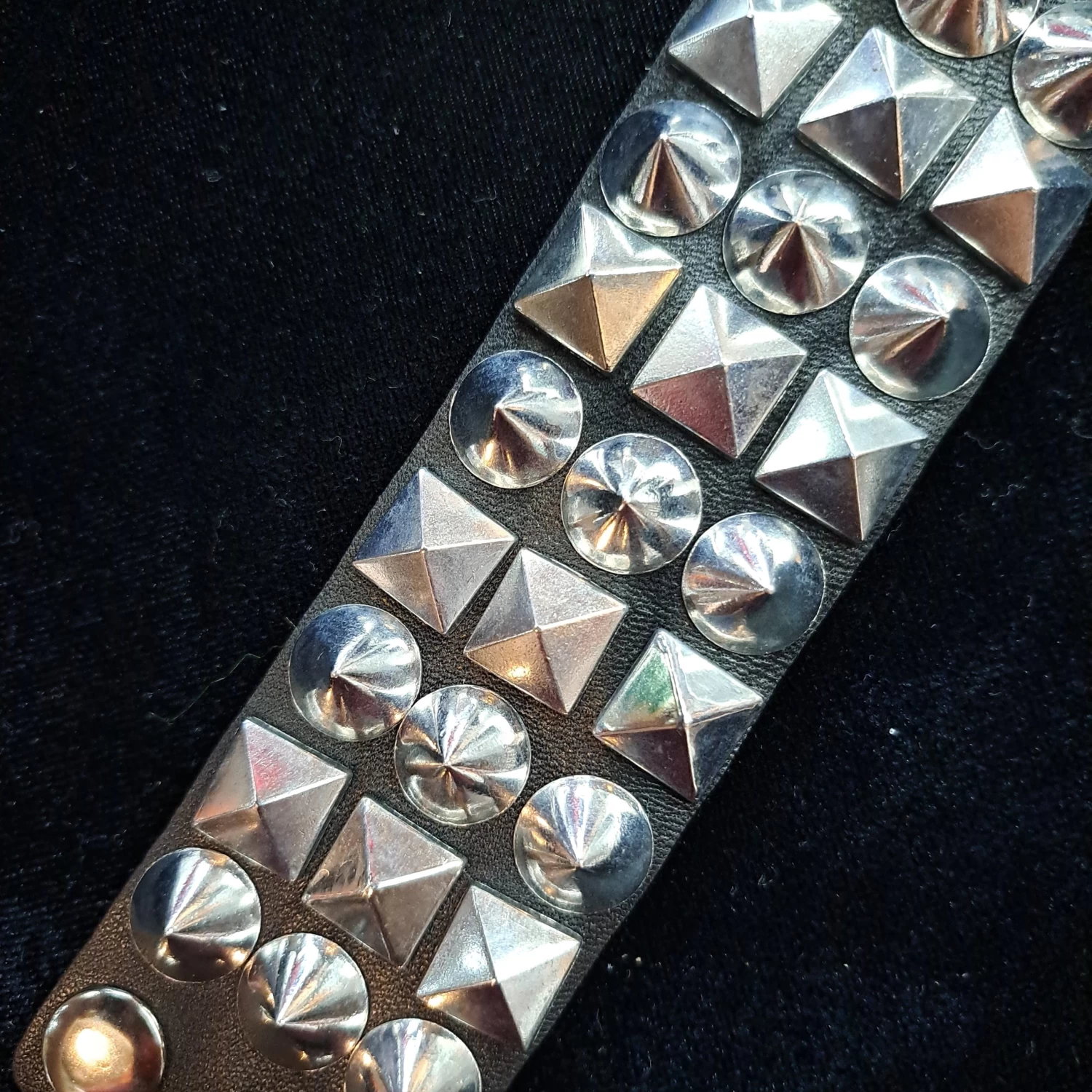 This black leather punk bracelet has 3 rows of silver alternating 1/2″ pyramid and cone studs with snaps to close. Great for punk, rockers, gothic, 80’s, grunge and so many more!