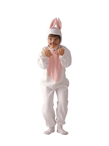 Who can resist this adorable bunny rabbit? The soft white flannellette fabric jumpsuit has a pink tummy with elastic ankles and wrists, a tie back and an attached tail. The costume also includes a white hood with attached ears. This costume is a perfect base for the White Rabbit in Alice in Wonderland, and Easter festivities. Makeup is available separately.