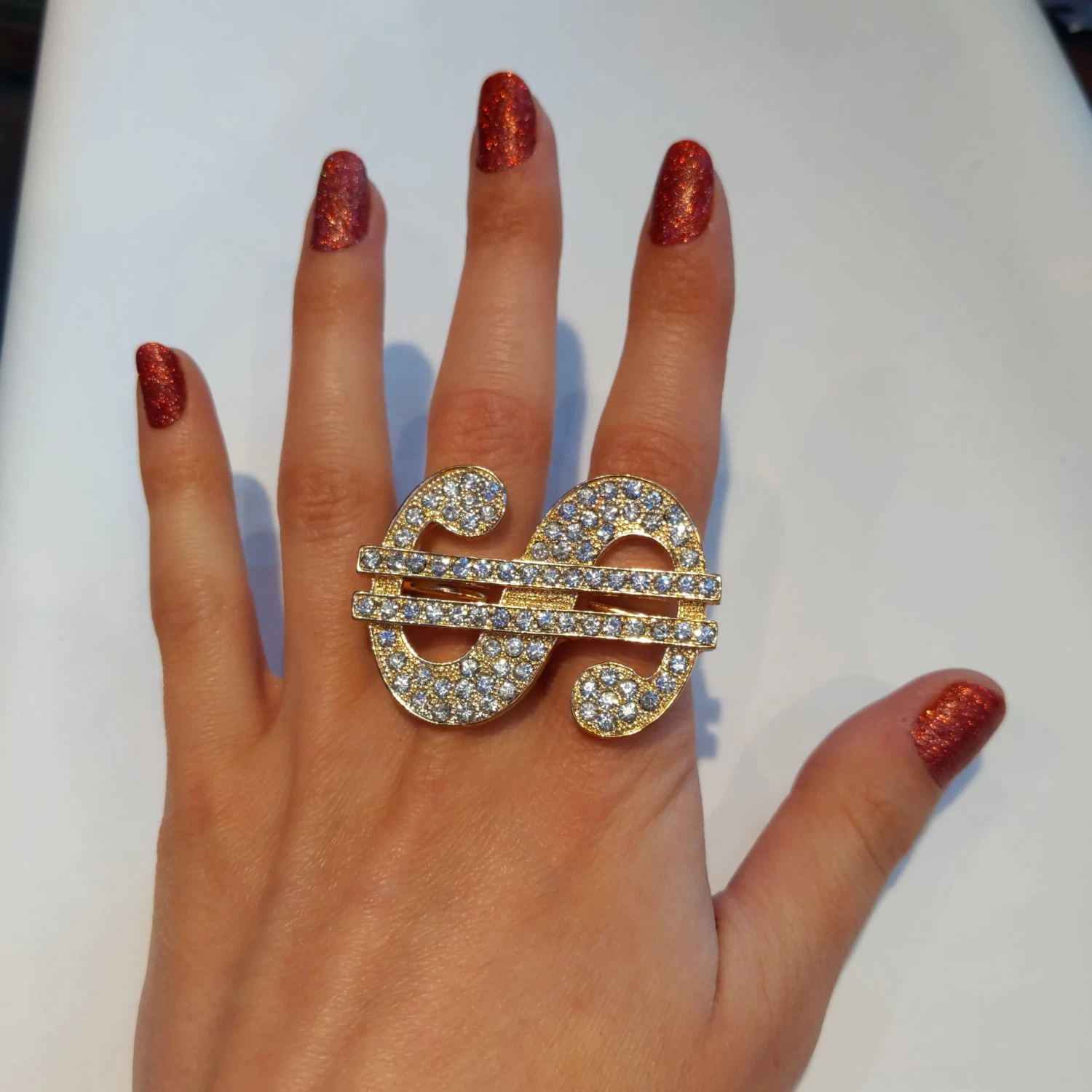 The Dollar Sign Ring in silver or gold is a great accessory for any big money look! This ring fits onto 2 fingers at once. Size 9
