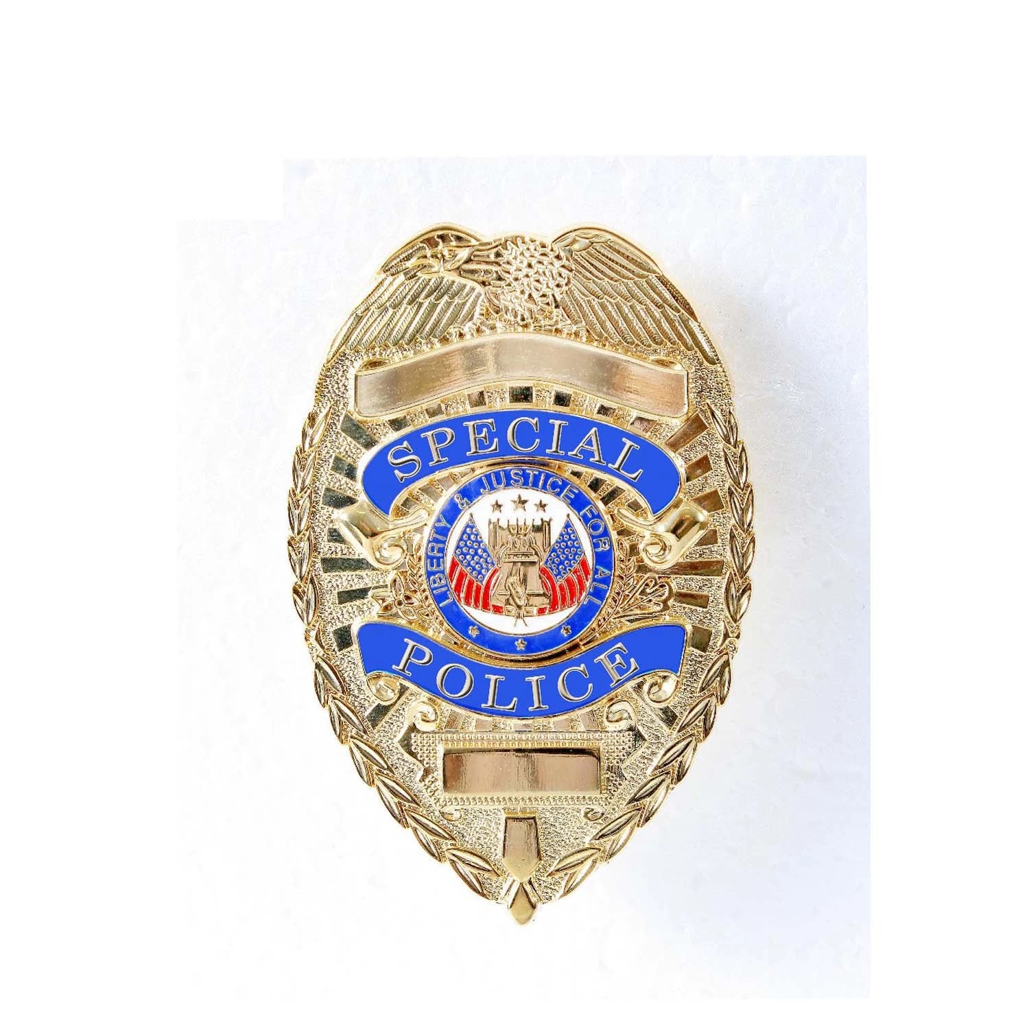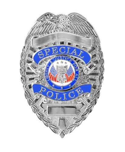 The Special Police Badge features a pin style back and is available in both silver and gold finishes with colored enamel plating.