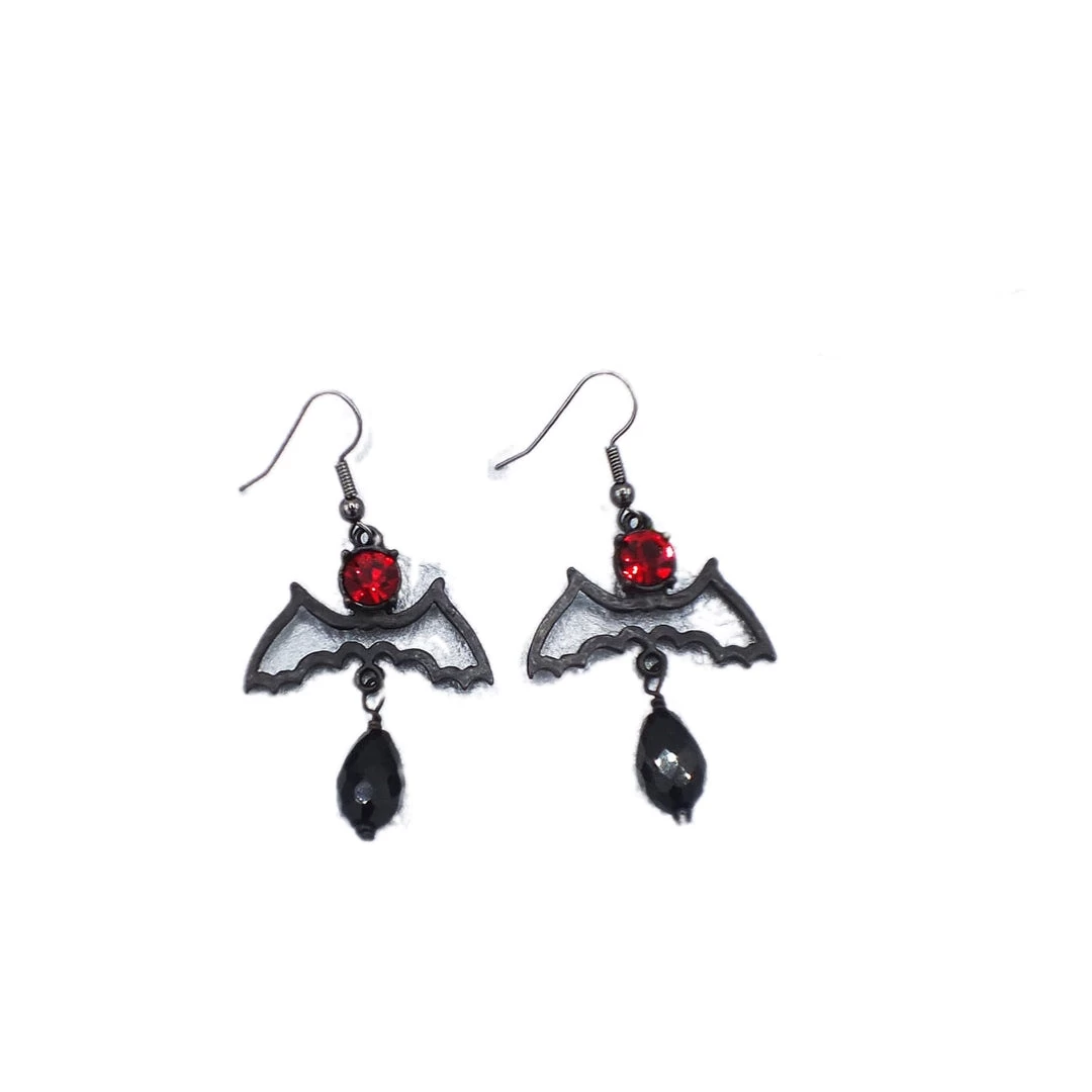 Silhouettes of bats include a round ruby stone on top plus a black teardrop bead hanging underneath.