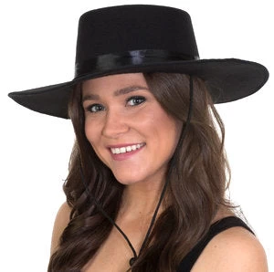 The black permafelt Spanish Style hat has a flat top, wide brim, black elastic sweatband, and an adjustable black chin strap. The perfect topper for your V for Vendetta, Zorro, Priest or Dia De Los Muertos Costume. One Size. Need it smaller? Check out our Foam Size reducer available here.