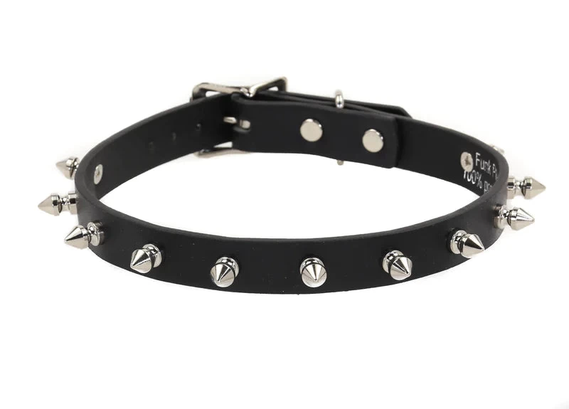 This 1/2″ or 3/4″ wide black leather choker has a single row of silver 1/2″ spikes with an adjustable buckle in the back.