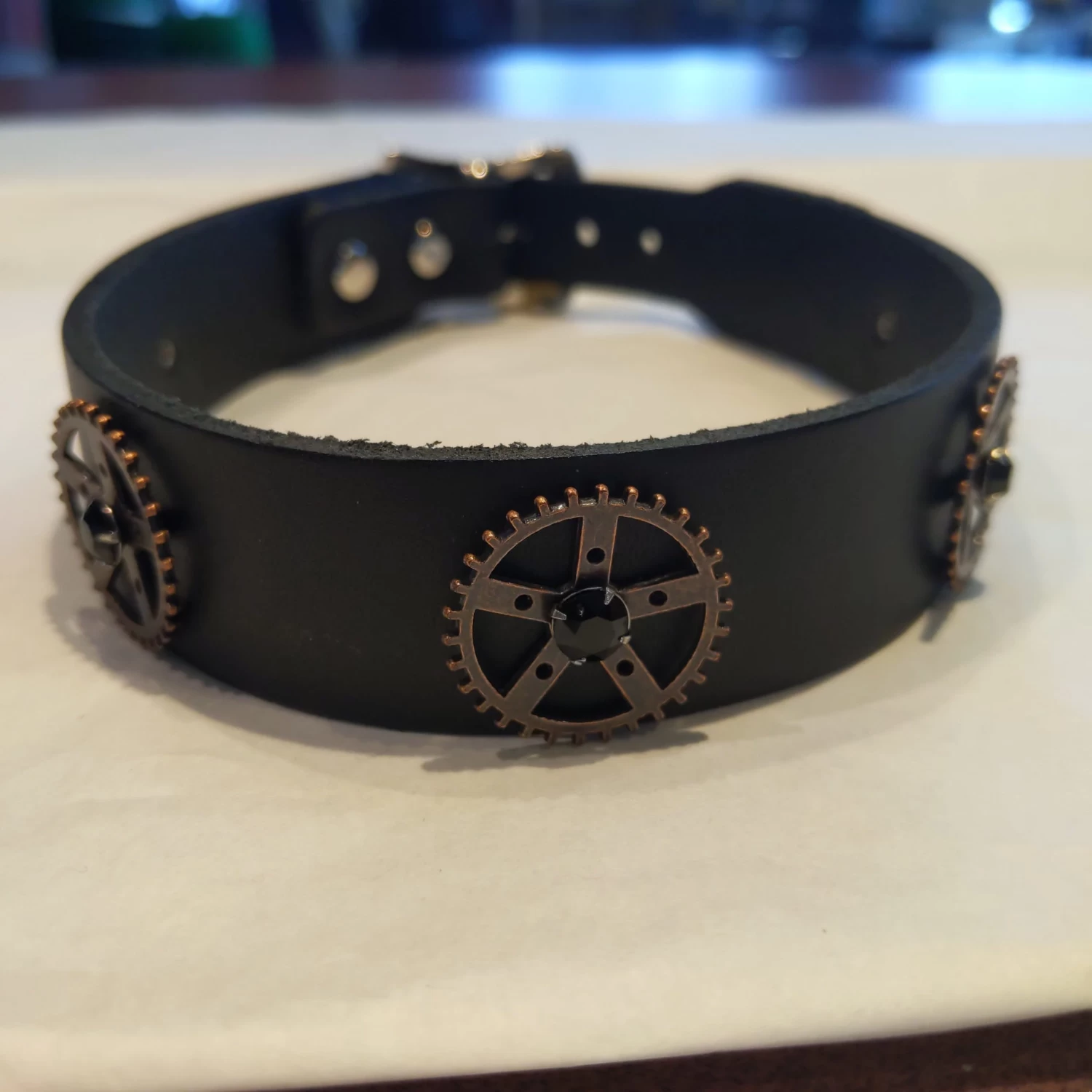 The black steampunk leather choker has copper-colored gears with small gems and an adjustable buckle in the back. Available with black or green gems. Made in the USA.