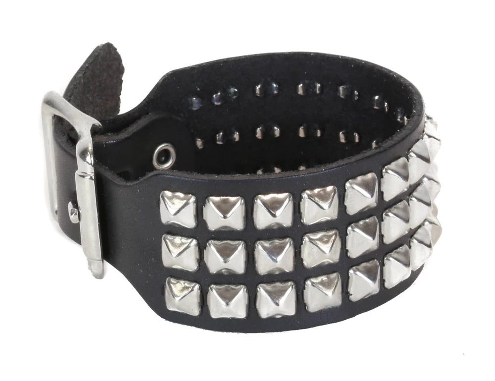This black leather bracelet has 3 rows of silver 1/4″ pyramid studs with a large buckle to close. Great for punk, rockers, gothic, 80’s, grunge and so many more!