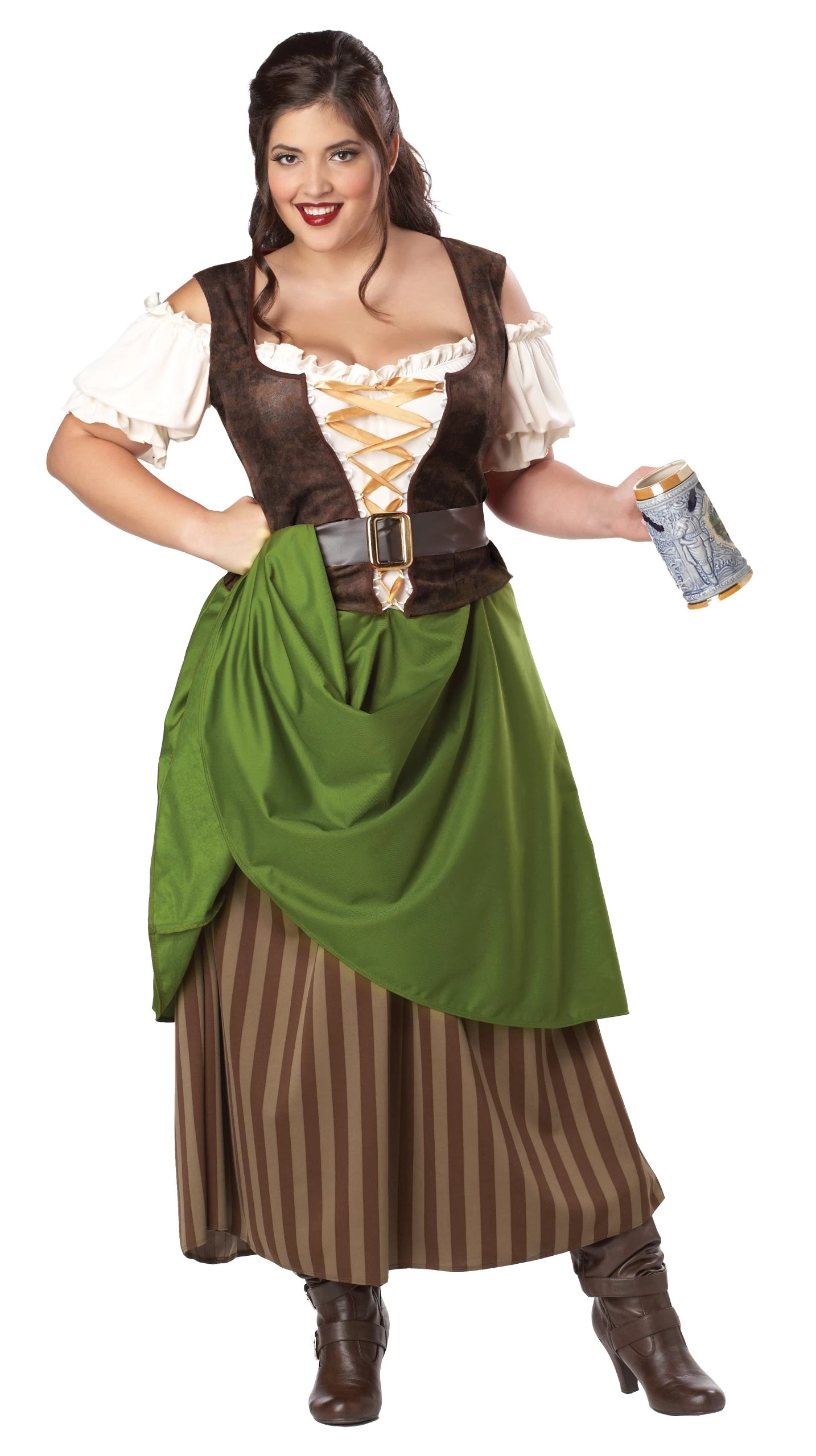 Click your beer steins together, because this Women’s Tavern Maiden Costume will transport you to the pubs of yesteryear. Costume features a dress with attached corset with lace up bodice and belt. Easily pull up the striped overlay for a flattering asymmetric look. Also available in smaller sizes.
