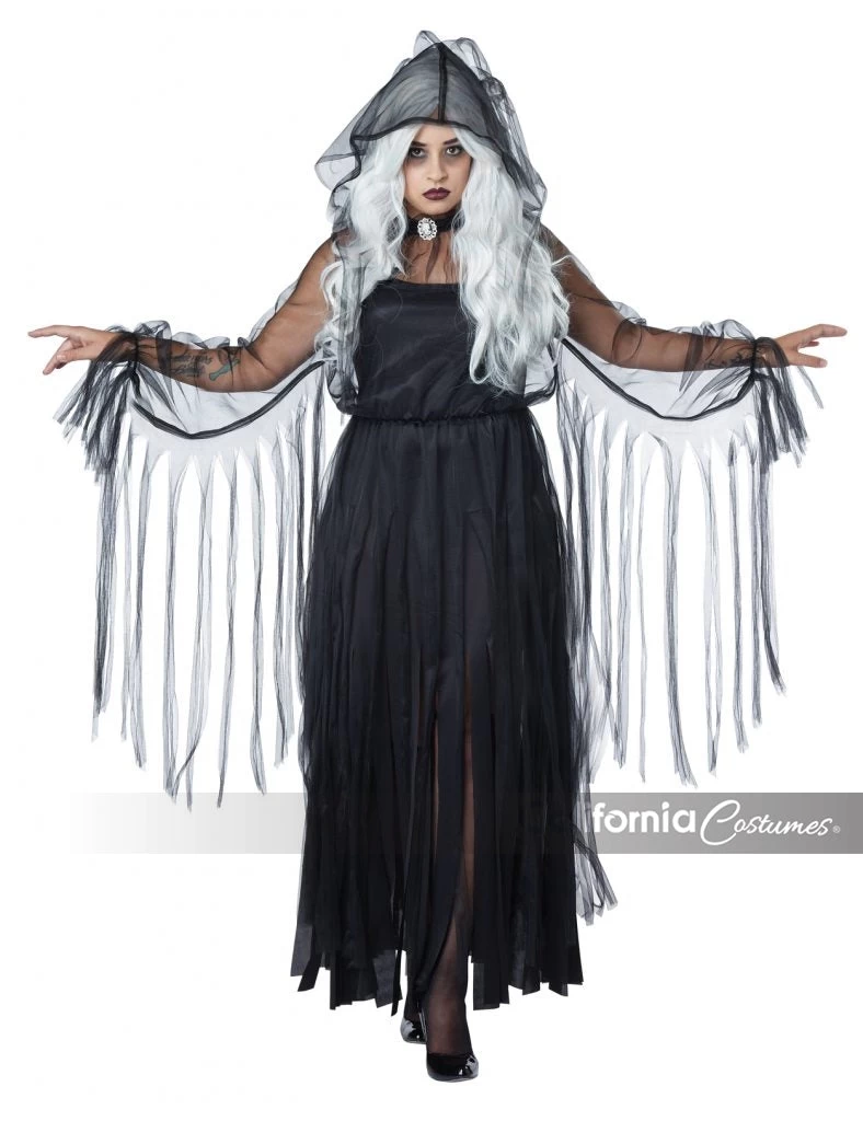 Eternal rest will wait until she has her revenge. The Vengeful Spirit ghost costume comes with a black dress and a sheer overdress. The overdress features flowing fabric strip sleeves and a detachable hood. A brooch is also included. Wig and makeup sold separately.